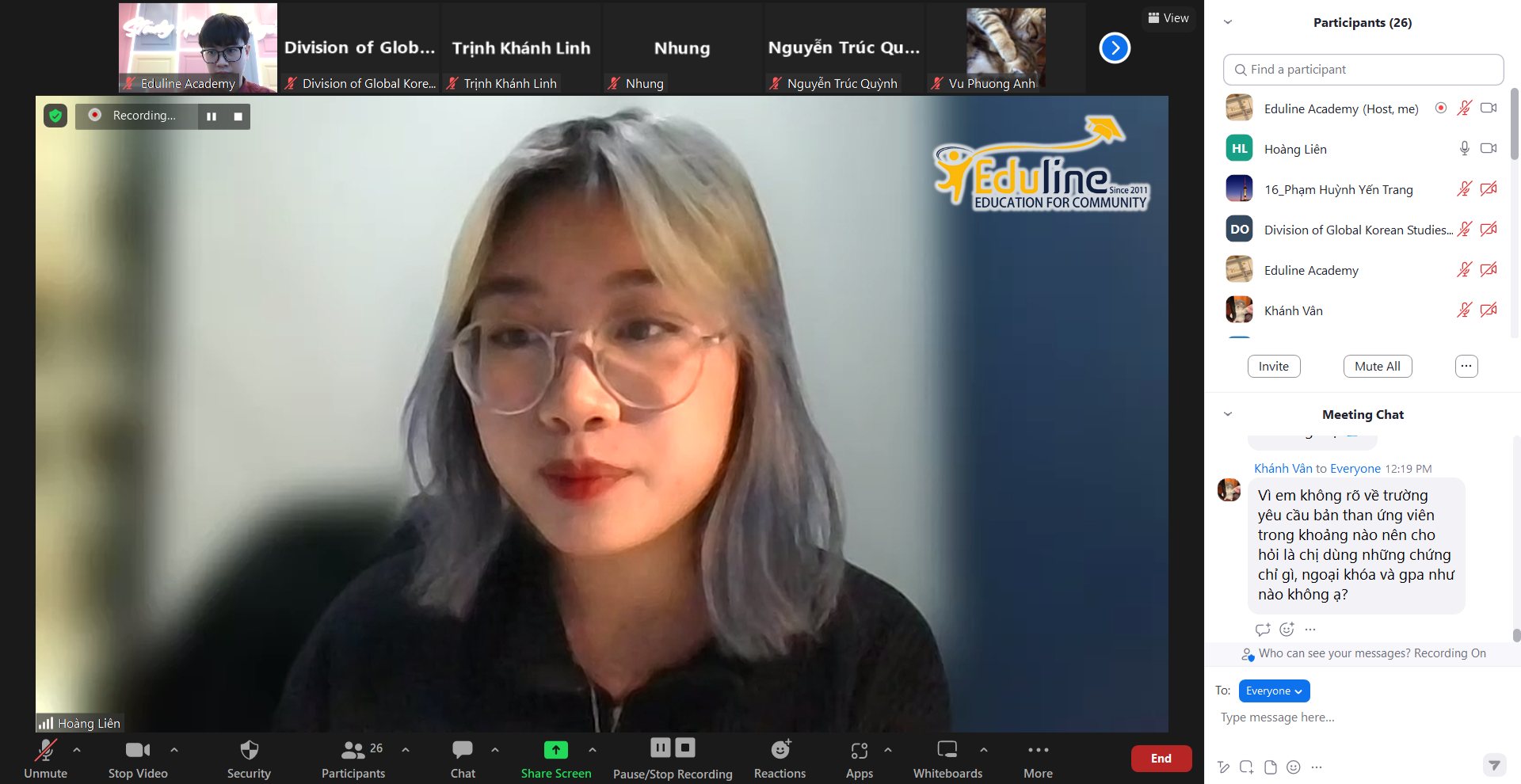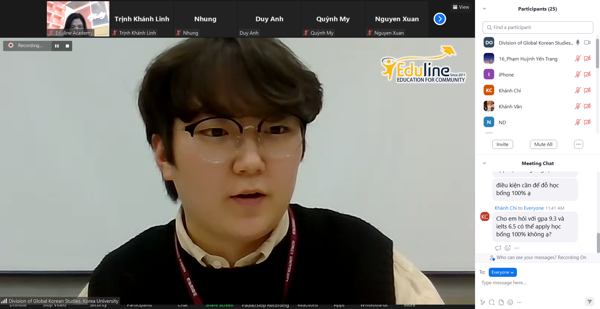 Vậy là một sự kiện đặc biệt nữa dành cho tất cả những ai đang quan tâm đến du học tại trường Đại học Korea – TOP SKY Hàn Quốc – đã khép lại vô cùng thành công! Với sự góp mặt của Giáo sư Lee đến từ khoa Global Korean Studies cùng Hoàng Liên và Hằng Nga – 2 bạn du học sinh của Eduline đang theo học tại Đại học Korea, buổi Webinar đã giúp các bạn học sinh giải đáp rất nhiều câu hỏi quan trọng cũng như đem đến những chia sẻ và kinh nghiệm vô cùng bổ ích về chủ đề du học Hàn Quốc.