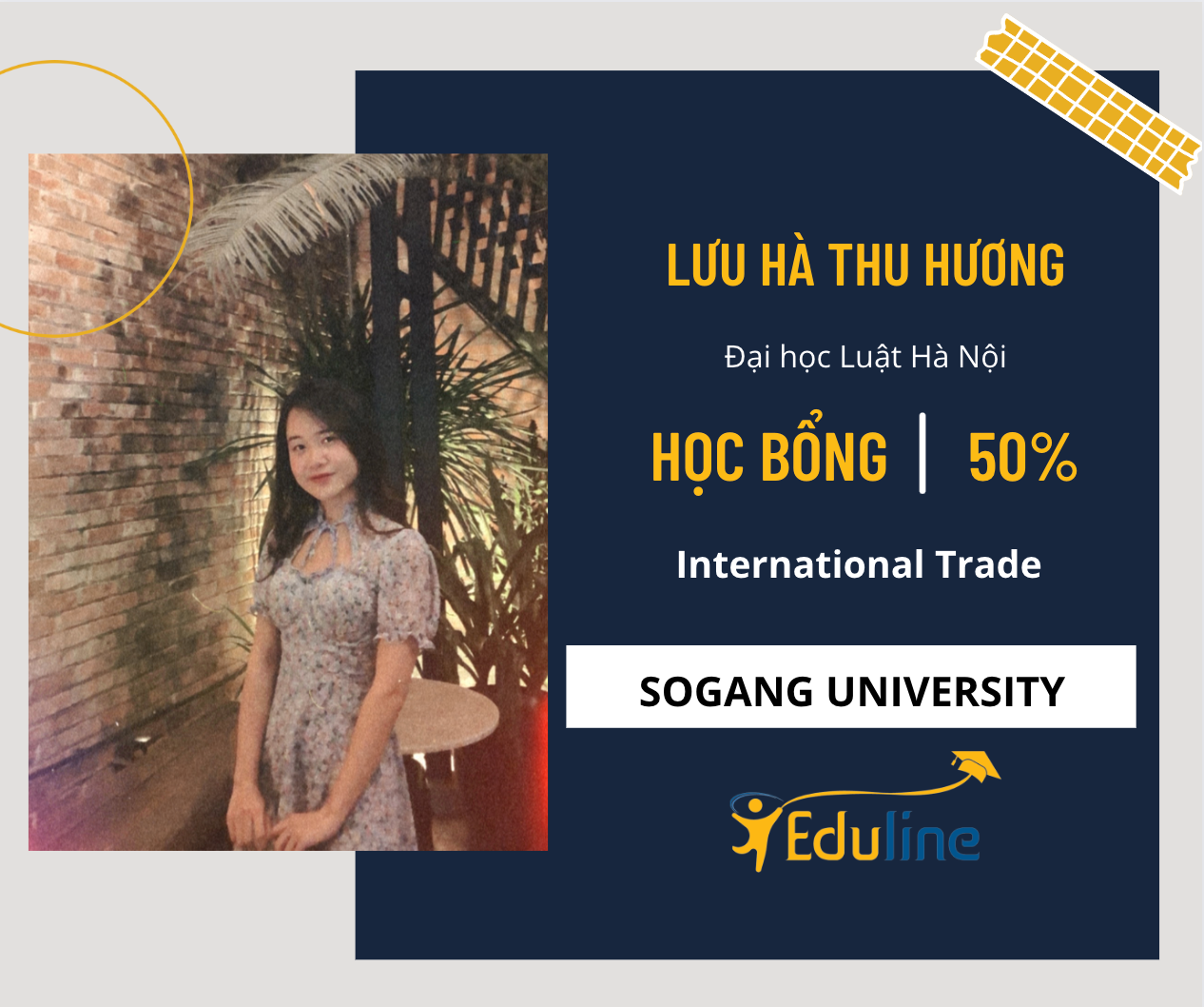 Thu Hương là cựu học sinh trường ĐH Luật Hà Nội chuyên ngành Luật kinh tế. Sau khi tốt nghiệp và đi làm một thời gian, Hương biết mình chưa thực sự phù hợp với ngành Luật và quyết tâm theo đuổi kinh doanh. Đó cũng là động lực khiếp em apply thành công học bổng hệ thạc sỹ chuyên ngành International Trade tại Sogang, ngôi trường xếp thứ 4 trong bảng xếp hạng các đại học danh tiếng của Hàn Quốc.